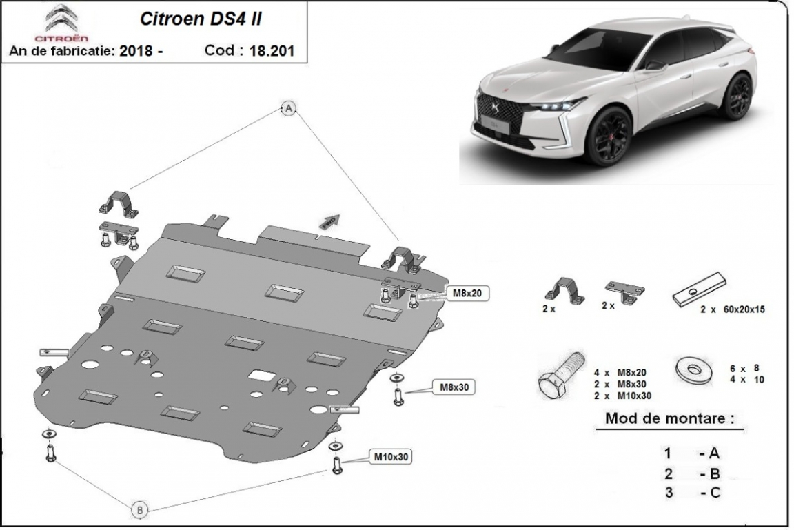 Skid plate for the protection of the: engine, gearbox, radiator, front bumper, subframe . The skid plate is new and fits perfectly for all versions of Citroen DS4 manufactured between 2021 and 2026. Made out of 2 mm thick Steel plate. Screws, nuts, clips, all fastening accessories are included. All skid plates are powder coated to prevent corrosion. The exterior of the skid plate is provided with Steel reinforcements, which increases the resistance to impact. |