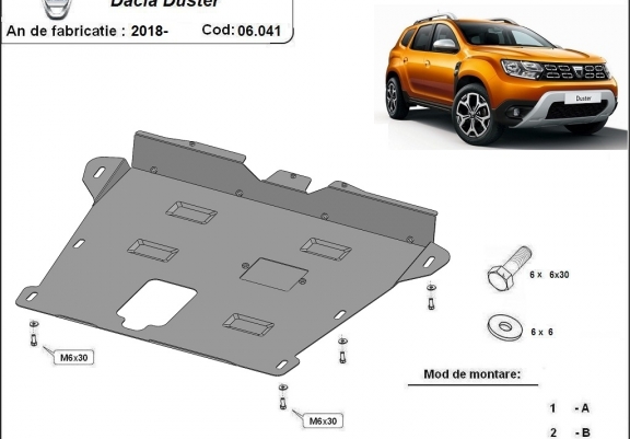 Skid plate for the protection of the: engine, gearbox . The skid plate is new and fits perfectly for all versions of Dacia Duster manufactured between 2018 and 2024. It has an opening for the oil sump, so it's removal won't be necessary to change the oil. Made out of 2 mm thick Steel plate. Screws, nuts, clips, all fastening accessories are included. All skid plates are powder coated to prevent corrosion. The exterior of the skid plate is provided with Steel reinforcements, which increases the resistance to impact. |
