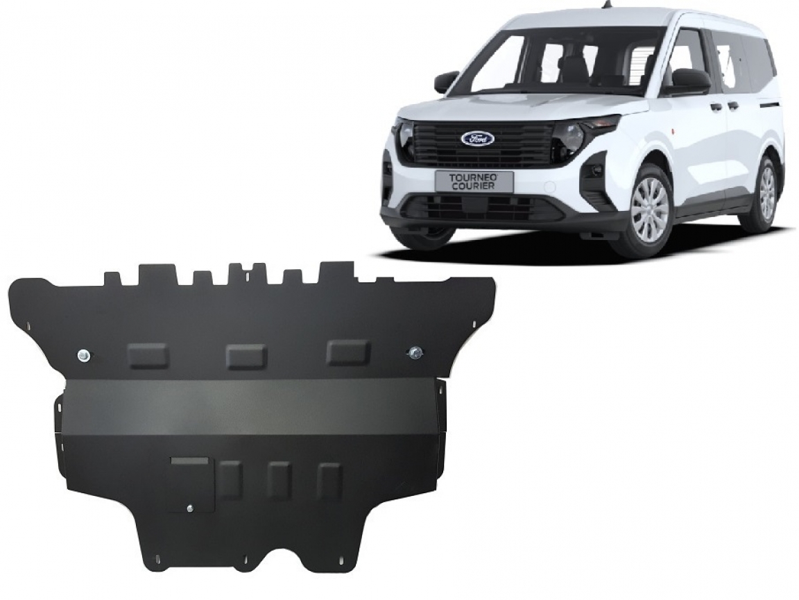 Skid plate for the protection of the: engine, gearbox, radiator, front bumper . The skid plate is new and fits perfectly for all versions of Ford Tourneo Connect manufactured between 2023 and 2026. Made out of 2 mm thick Steel plate. Screws, nuts, clips, all fastening accessories are included. All skid plates are powder coated to prevent corrosion. The exterior of the skid plate is provided with Steel reinforcements, which increases the resistance to impact. |