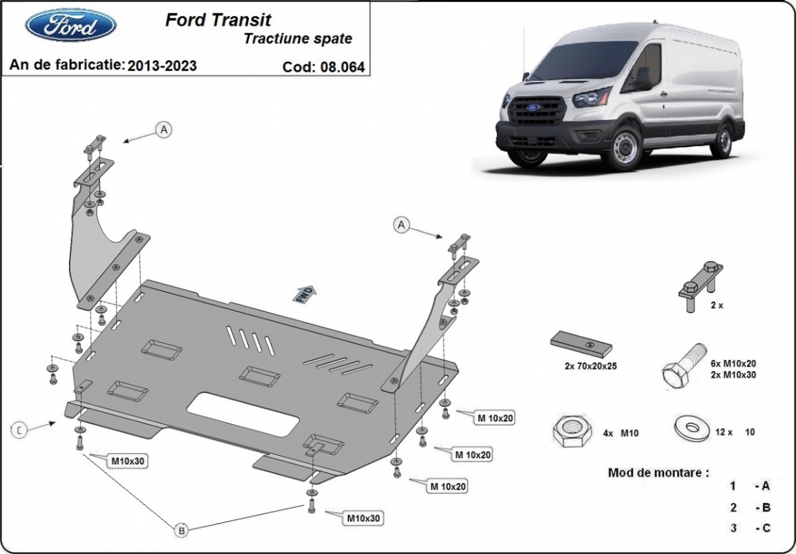 Skid plate for the protection of the: engine, gearbox, radiator . The skid plate is new and fits perfectly for all versions of Ford Transit - RWD manufactured between 2013 and 2023. Made out of 2.5 mm thick Steel plate. Screws, nuts, clips, all fastening accessories are included. All skid plates are powder coated to prevent corrosion. The exterior of the skid plate is provided with Steel reinforcements, which increases the resistance to impact. |