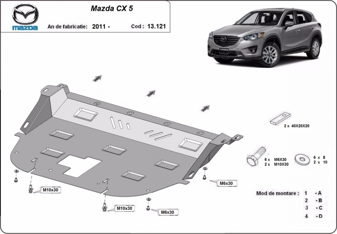 Skid plate for the protection of the: engine, gearbox, radiator . The skid plate is new and fits perfectly for all versions of Mazda CX5 manufactured between 2011 and 2026. Made out of 2 mm thick Steel plate. Screws, nuts, clips, all fastening accessories are included. All skid plates are powder coated to prevent corrosion. The exterior of the skid plate is provided with Steel reinforcements, which increases the resistance to impact. |