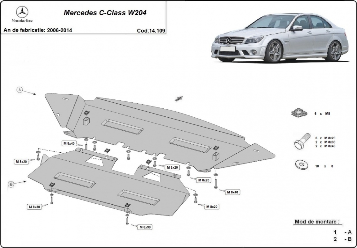 Skid plate for the protection of the: engine, radiator, front bumper . The skid plate is new and fits perfectly for all versions of Mercedes C-Class W204 manufactured between 2006 and 2014. Made out of 2 mm thick Steel plate. Screws, nuts, clips, all fastening accessories are included. All skid plates are powder coated to prevent corrosion. The exterior of the skid plate is provided with Steel reinforcements, which increases the resistance to impact. |