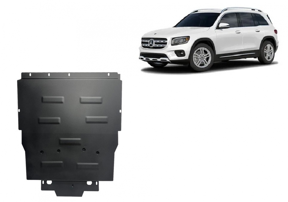 Skid plate for the protection of the: engine, gearbox, radiator . The skid plate is new and fits perfectly for all versions of Mercedes GLB X247 manufactured between 2019 and 2026. Made out of 2 mm thick Steel plate. Screws, nuts, clips, all fastening accessories are included. All skid plates are powder coated to prevent corrosion. The exterior of the skid plate is provided with Steel reinforcements, which increases the resistance to impact. |