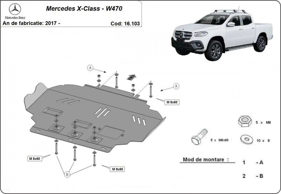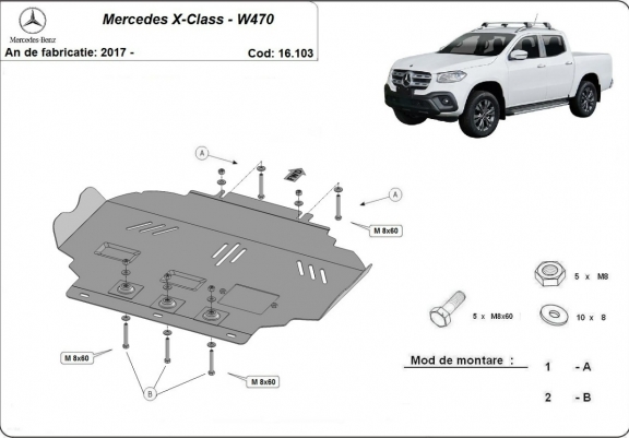 Skid plate for the protection of the: engine . The skid plate is new and fits perfectly for all versions of Mercedes X-Class manufactured between 2017 and 2020. It has an opening for the oil sump, so it's removal won't be necessary to change the oil. Made out of 2.5 mm thick Steel plate. Screws, nuts, clips, all fastening accessories are included. All skid plates are powder coated to prevent corrosion. The exterior of the skid plate is provided with Steel reinforcements, which increases the resistance to impact. |