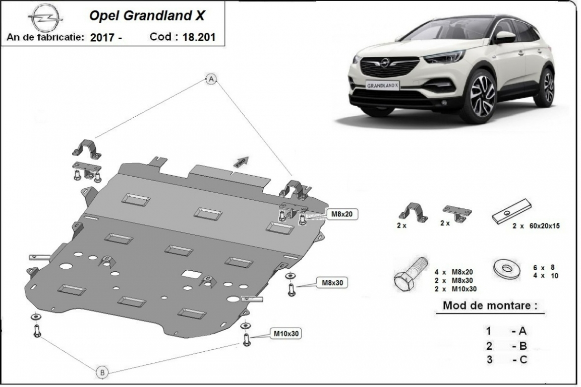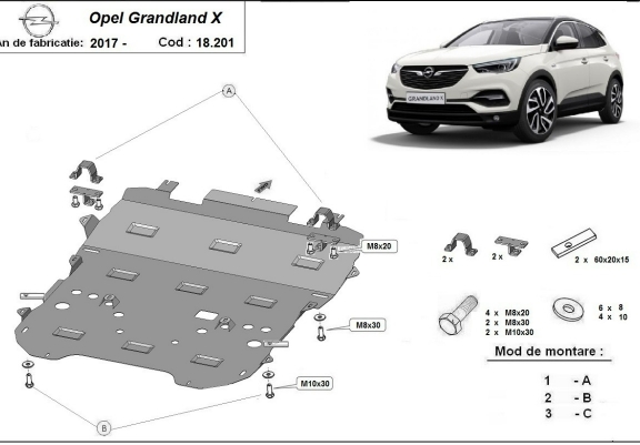 Skid plate for the protection of the: engine, gearbox, radiator, front bumper, subframe . The skid plate is new and fits perfectly for all versions of Opel Grandland X manufactured between 2017 and 2026. Made out of 2 mm thick Steel plate. Screws, nuts, clips, all fastening accessories are included. All skid plates are powder coated to prevent corrosion. The exterior of the skid plate is provided with Steel reinforcements, which increases the resistance to impact. |