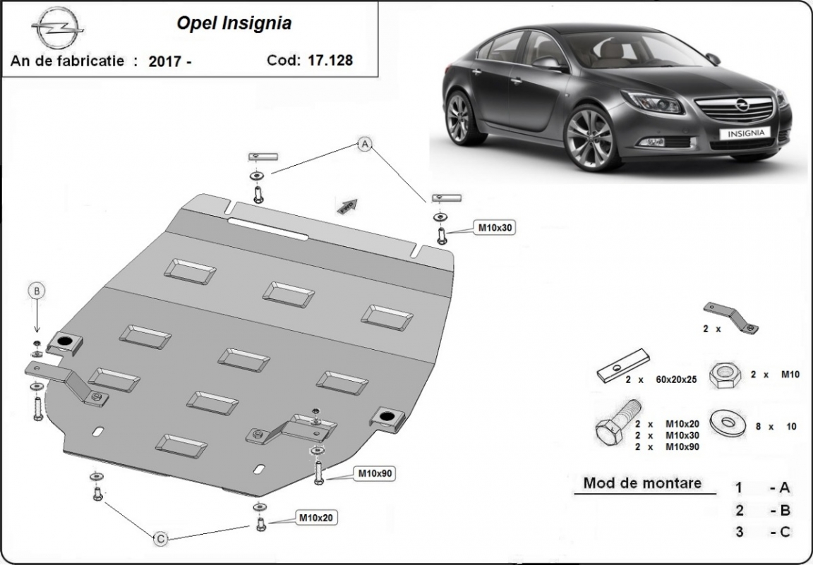 Skid plate for the protection of the: engine, gearbox, radiator . The skid plate is new and fits perfectly for all versions of Opel Insignia manufactured between 2017 and 2026. Made out of 2 mm thick Steel plate. Screws, nuts, clips, all fastening accessories are included. All skid plates are powder coated to prevent corrosion. The exterior of the skid plate is provided with Steel reinforcements, which increases the resistance to impact. |