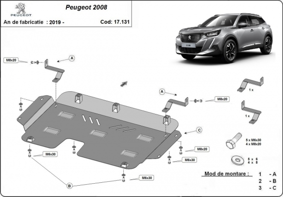 Skid plate for the protection of the: engine, gearbox, radiator . The skid plate is new and fits perfectly for all versions of Peugeot 2008 manufactured between 2019 and 2026. Made out of 2 mm thick Steel plate. Screws, nuts, clips, all fastening accessories are included. All skid plates are powder coated to prevent corrosion. The exterior of the skid plate is provided with Steel reinforcements, which increases the resistance to impact. |