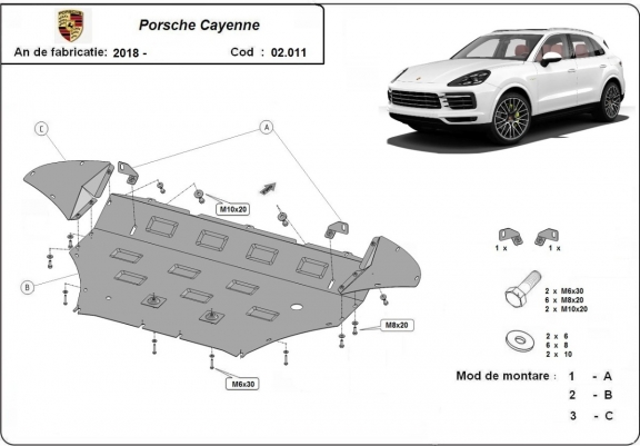 Skid plate for the protection of the: engine, radiator, front bumper . The skid plate is new and fits perfectly for all versions of Porsche Cayenne manufactured between 2018 and 2026. Made out of 2 mm thick Steel plate. Screws, nuts, clips, all fastening accessories are included. All skid plates are powder coated to prevent corrosion. The exterior of the skid plate is provided with Steel reinforcements, which increases the resistance to impact. |
