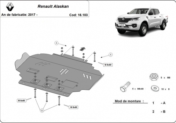 Skid plate for the protection of the: engine . The skid plate is new and fits perfectly for all versions of Renault Alaskan manufactured between 2017 and 2026. Made out of 2.5 mm thick Steel plate. Screws, nuts, clips, all fastening accessories are included. All skid plates are powder coated to prevent corrosion. The exterior of the skid plate is provided with Steel reinforcements, which increases the resistance to impact. |