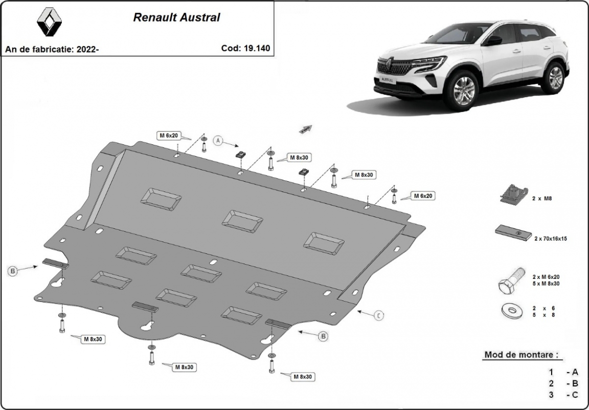 Skid plate for the protection of the: engine, gearbox, radiator . The skid plate is new and fits perfectly for all versions of Renault Austral manufactured between 2022 and 2026. Made out of 2 mm thick Steel plate. Screws, nuts, clips, all fastening accessories are included. All skid plates are powder coated to prevent corrosion. The exterior of the skid plate is provided with Steel reinforcements, which increases the resistance to impact. |