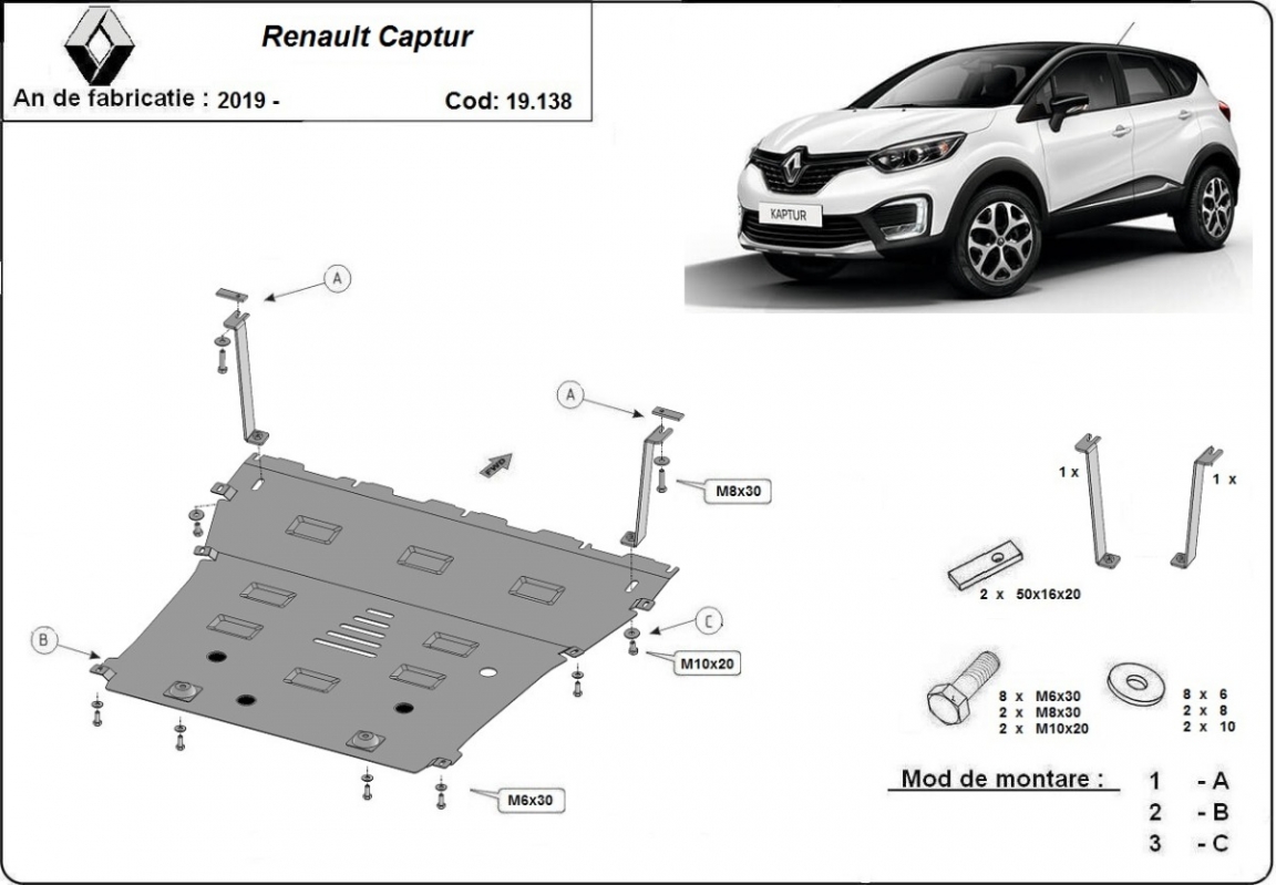 Skid plate for the protection of the: engine, gearbox, radiator . The skid plate is new and fits perfectly for all versions of Renault Captur manufactured between 2019 and 2026. Made out of 2 mm thick Steel plate. Screws, nuts, clips, all fastening accessories are included. All skid plates are powder coated to prevent corrosion. The exterior of the skid plate is provided with Steel reinforcements, which increases the resistance to impact. |