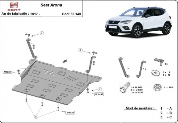 Skid plate for the protection of the: engine, gearbox, radiator, front bumper, DPF , particle filter . The skid plate is new and fits perfectly for all versions of Seat Arona manufactured between 2017 and 2026. Made out of 2 mm thick Steel plate. Screws, nuts, clips, all fastening accessories are included. All skid plates are powder coated to prevent corrosion. The exterior of the skid plate is provided with Steel reinforcements, which increases the resistance to impact. |