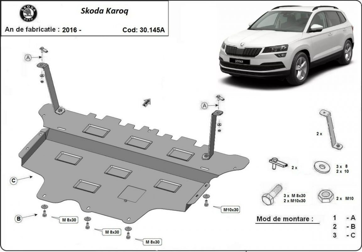 Skid plate for the protection of the: engine, gearbox, radiator, front bumper . The skid plate is new and fits perfectly for all versions of Skoda Karoq manufactured between 2017 and 2026. It has an opening for the oil sump, so it's removal won't be necessary to change the oil. Made out of 2 mm thick Steel plate. Screws, nuts, clips, all fastening accessories are included. All skid plates are powder coated to prevent corrosion. The exterior of the skid plate is provided with Steel reinforcements, which increases the resistance to impact. |