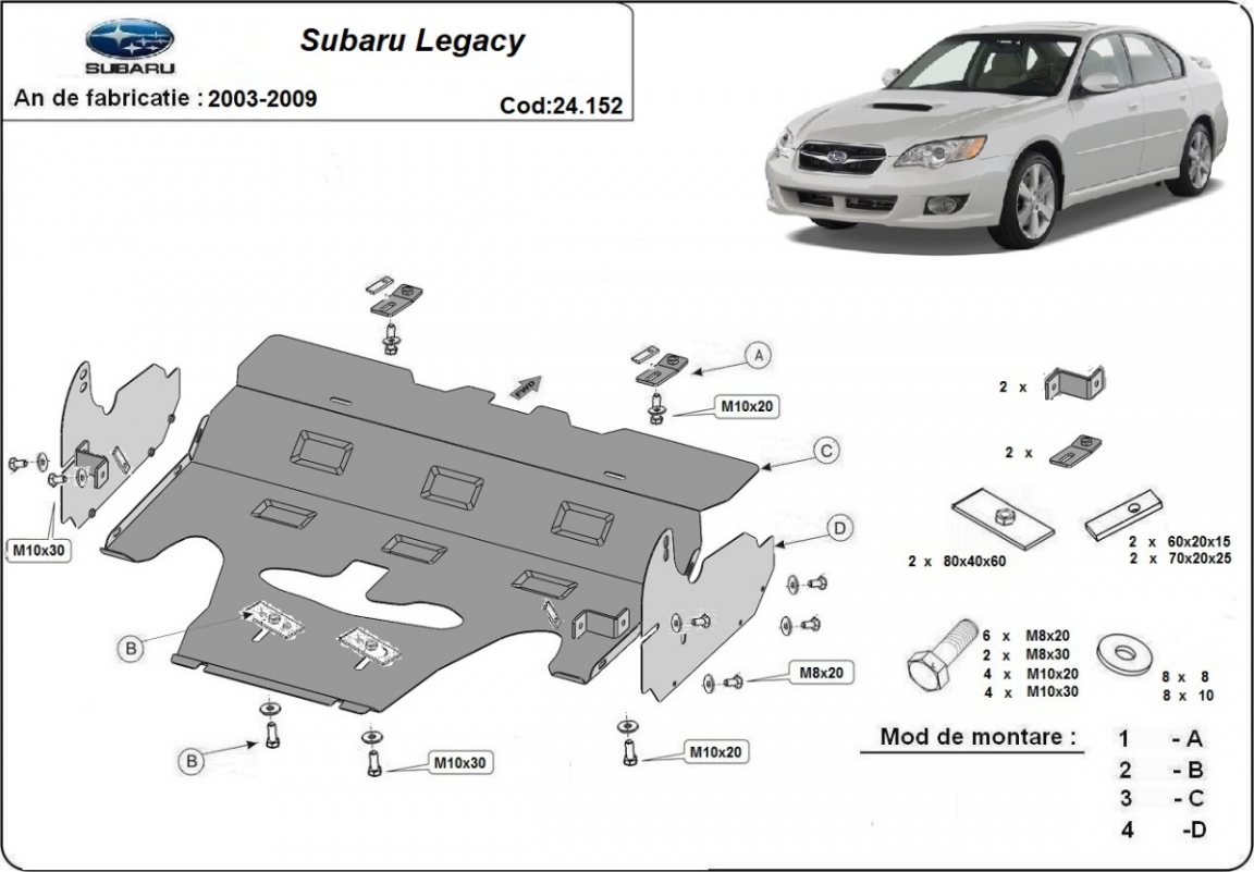Skid plate for the protection of the: engine, radiator . The skid plate is new and fits perfectly for all versions of Subaru Legacy IV manufactured between 2003 and 2009. Made out of 2 mm thick Steel plate. Screws, nuts, clips, all fastening accessories are included. All skid plates are powder coated to prevent corrosion. The exterior of the skid plate is provided with Steel reinforcements, which increases the resistance to impact. |