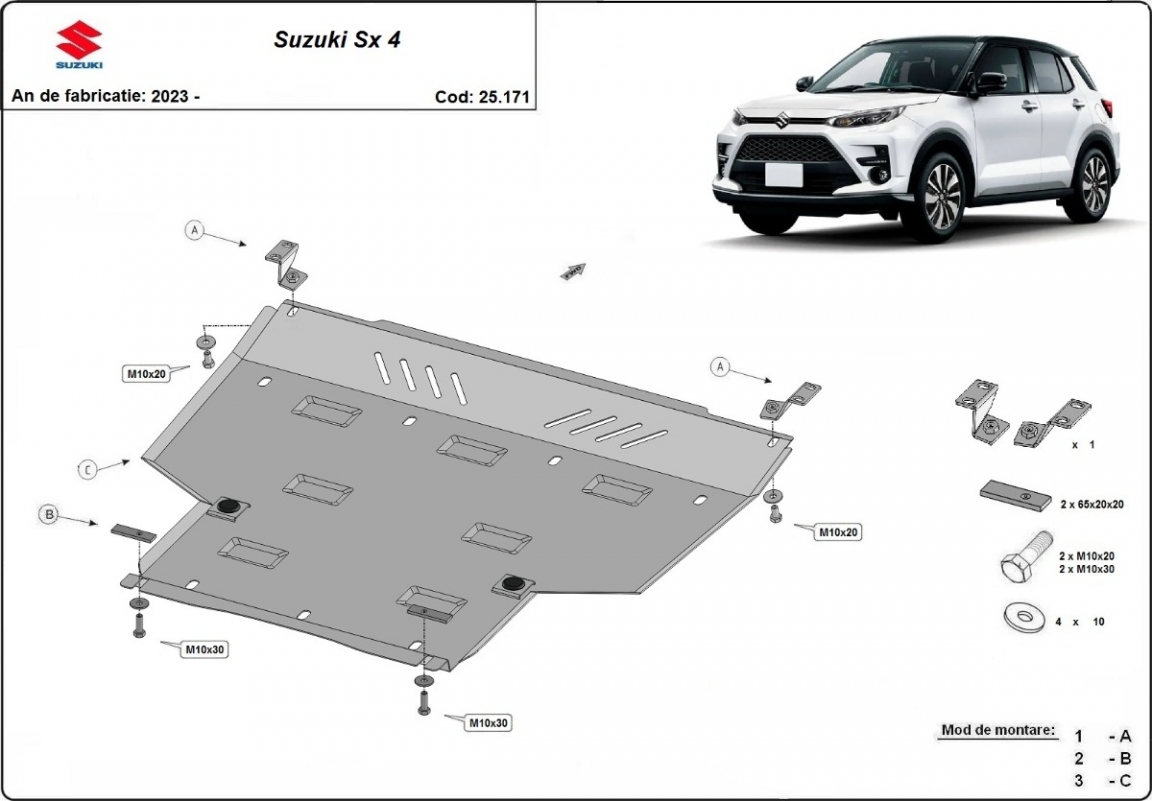 Skid plate for the protection of the: engine, gearbox . The skid plate is new and fits perfectly for all versions of Suzuki SX 4 manufactured between 2023 and 2026. Made out of mm thick Steel plate. Screws, nuts, clips, all fastening accessories are included. All skid plates are powder coated to prevent corrosion. The exterior of the skid plate is provided with Steel reinforcements, which increases the resistance to impact. |