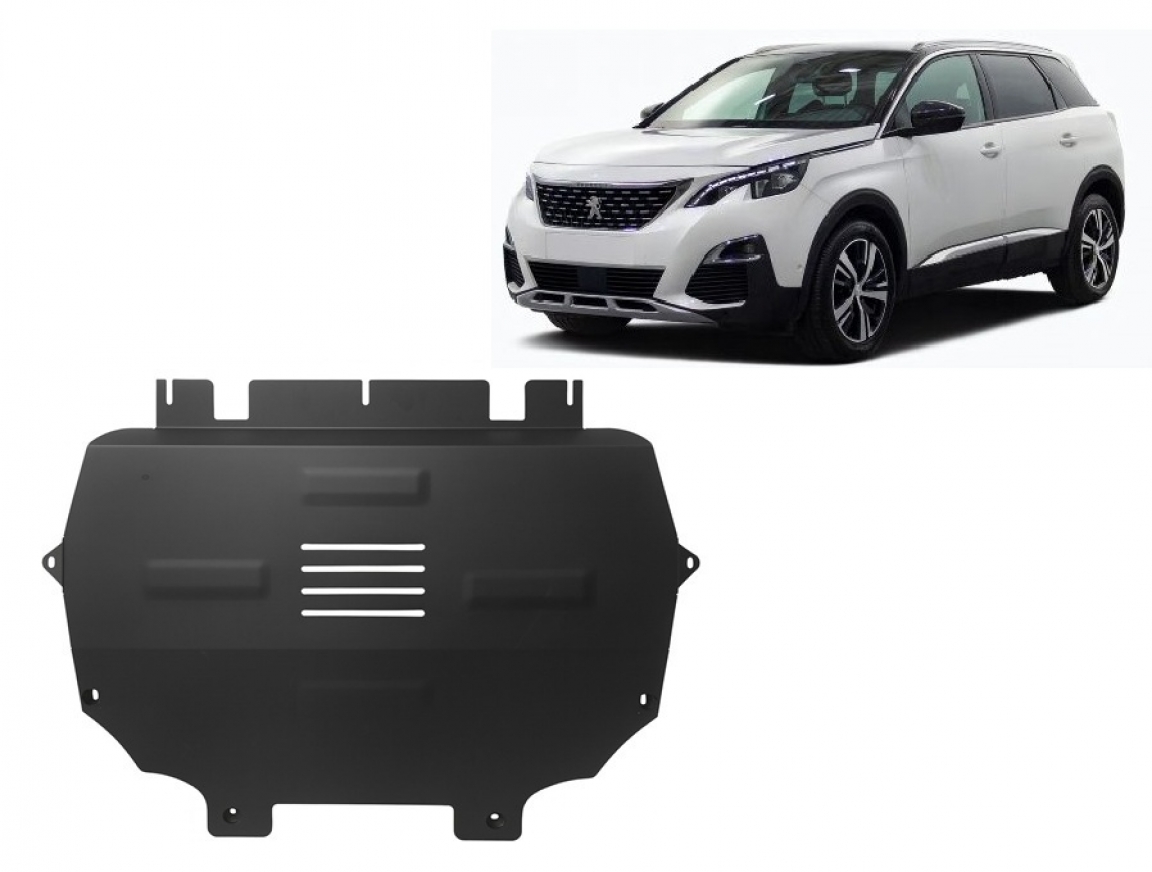 Skid plate for the protection of the: engine, gearbox, radiator . The skid plate is new and fits perfectly for all versions of Peugeot 5008 manufactured between 2017 and 2026. Made out of 2 mm thick Steel plate. Screws, nuts, clips, all fastening accessories are included. All skid plates are powder coated to prevent corrosion. The exterior of the skid plate is provided with Steel reinforcements, which increases the resistance to impact. |