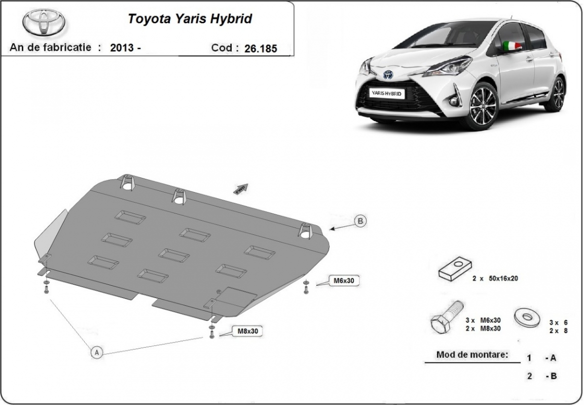Skid plate for the protection of the: engine, gearbox, radiator . The skid plate is new and fits perfectly for the Toyota Yaris Hybrid, with the following engine/drive versions: XP150, all, Hybrid - manufactured between 2013 and 2021. Made out of 2 mm thick Steel plate. Screws, nuts, clips, all fastening accessories are included. All skid plates are powder coated to prevent corrosion. The exterior of the skid plate is provided with Steel reinforcements, which increases the resistance to impact. |