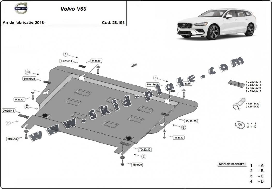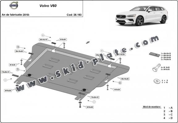Skid plate for the protection of the: engine, gearbox . The skid plate is new and fits perfectly for all versions of Volvo V60 manufactured between 2018 and 2025. Made out of 2 mm thick Steel plate. Screws, nuts, clips, all fastening accessories are included. All skid plates are powder coated to prevent corrosion. The exterior of the skid plate is provided with Steel reinforcements, which increases the resistance to impact. |