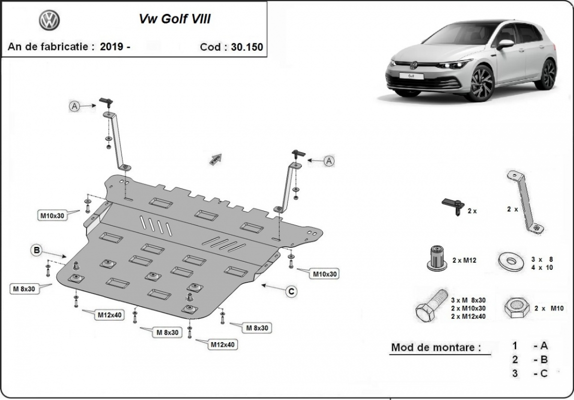 Skid plate for the protection of the: engine, gearbox, radiator . The skid plate is new and fits perfectly for all versions of VW Golf 8 manufactured between 2019 and 2026. Made out of 2 mm thick Steel plate. Screws, nuts, clips, all fastening accessories are included. All skid plates are powder coated to prevent corrosion. The exterior of the skid plate is provided with Steel reinforcements, which increases the resistance to impact. |