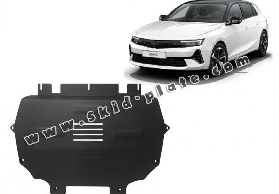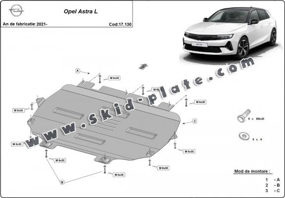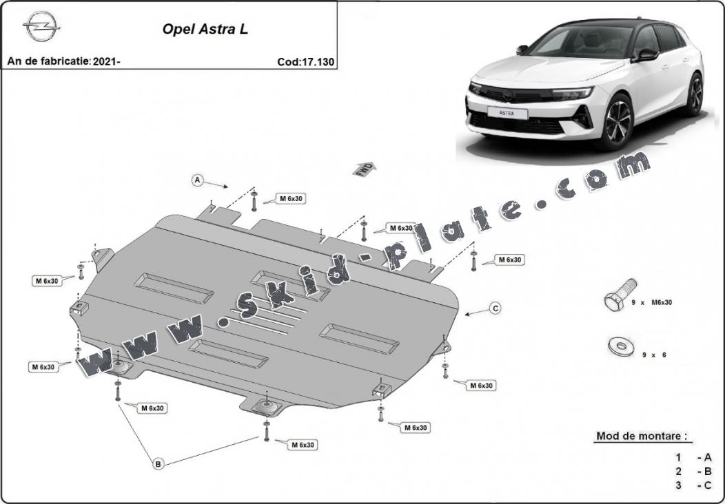 Skid plate for the protection of the: engine, gearbox, radiator . The skid plate is new and fits perfectly for all versions of Opel Astra L manufactured between 2021 and 2025. Made out of 2 mm thick Steel plate. Screws, nuts, clips, all fastening accessories are included. All skid plates are powder coated to prevent corrosion. The exterior of the skid plate is provided with Steel reinforcements, which increases the resistance to impact. |